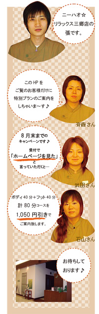 受付時やご予約時に“HPで三人娘を見た”と伝えていただければ、